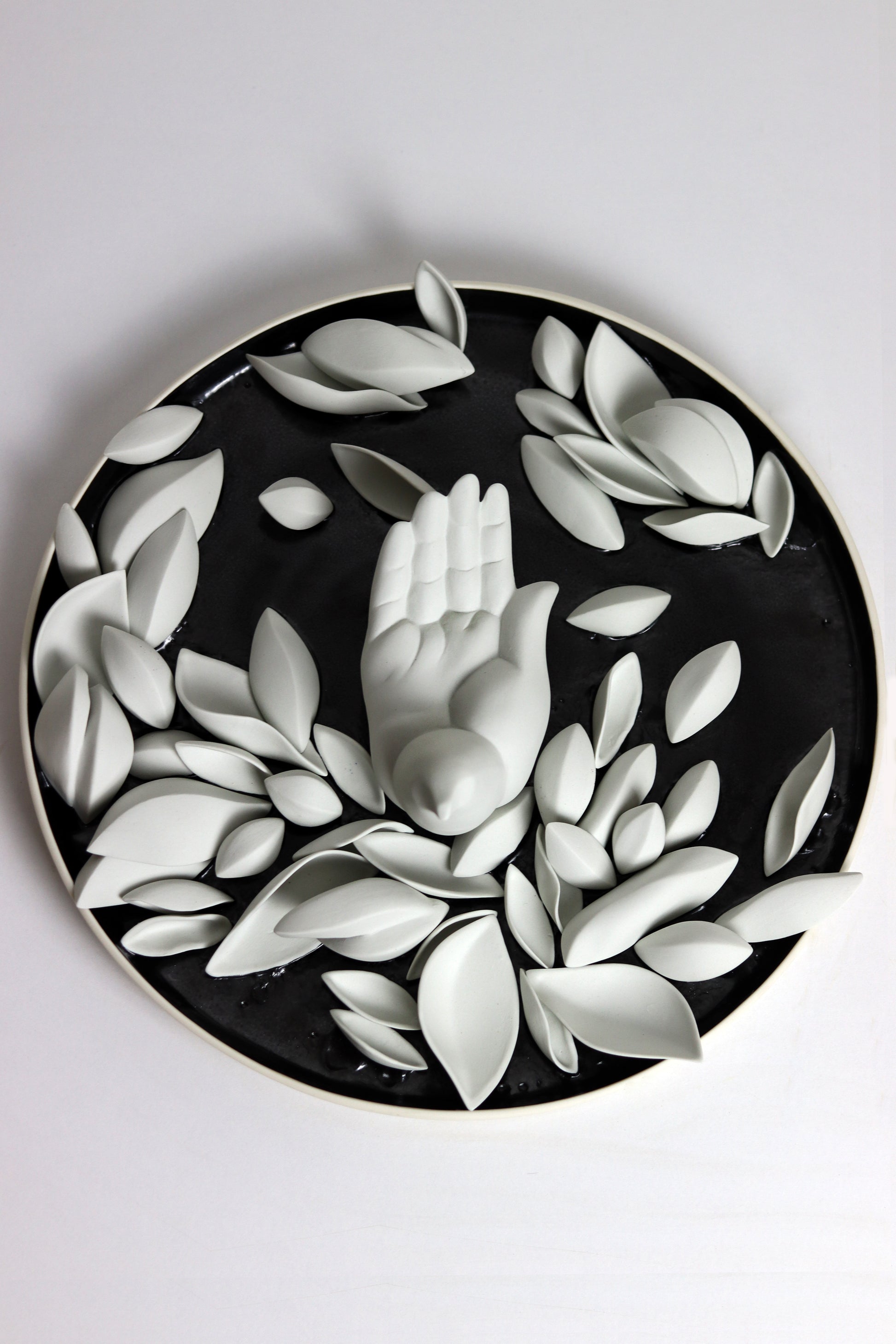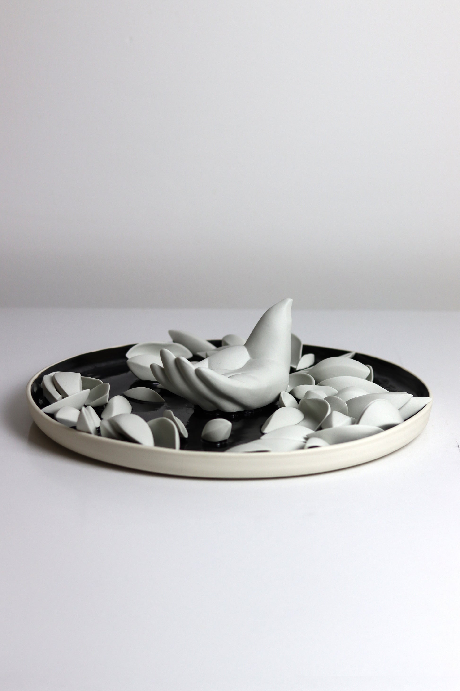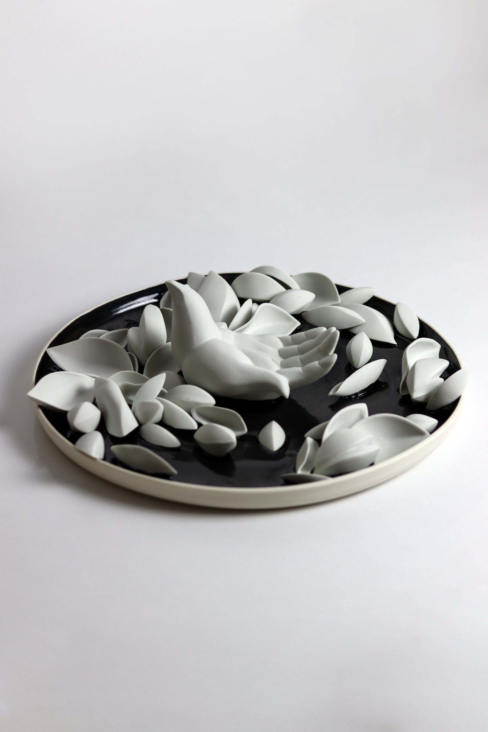 Korongozott porcelán tál, öntött porcelán figurával a Forms of touch sorozatból. Készült oxidációban 2024-ben.